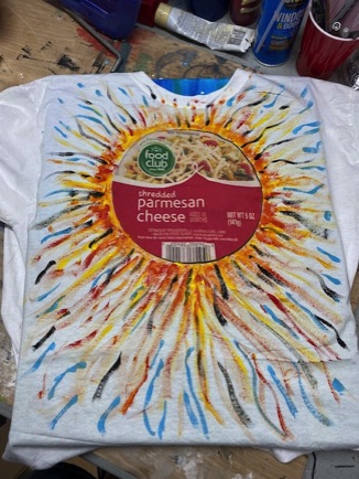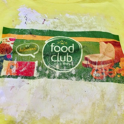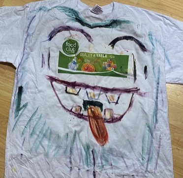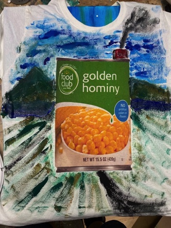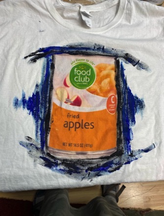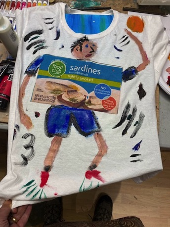 Started painting t-shirts to celebrate the generic grocery store brand - FOOD CLUB. There's something about their labeling that I really like. My wife Sarah is modeling her T-shirt - Food Club Oysters being grabbed by a crab