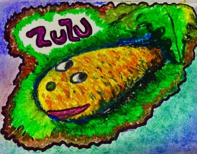 Conceptual drawing for Project ZuZu. Basically a talking zucchini that perpelexed the neighborhood. I used a zoom camera and an amplifer.