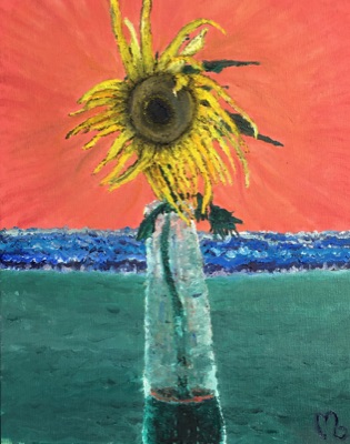 A very real sunflower from the garden in a vase doing the Eye of Sauron dealio on some imagined plain. Oil.