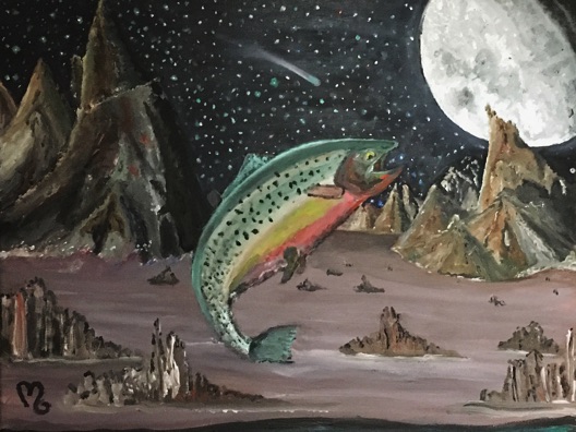 I made this for my brother Joe. He and I share a love of fishing, science fiction, Peter Sellers and David Bowie. Where's David Bowie? Oh Ziggy Stardust is there. Peter Sellers is not. I tried to convey earthly and celestial beauty in a weird, hallucinatory revelry. Oil.