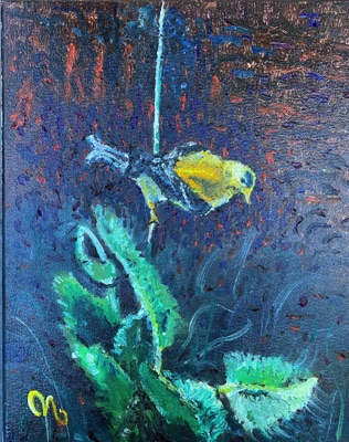 This goldfinch loved playing in the beets. But, every once in a while, he would pop up on a poppy stalk and say "howdy!" Oil.