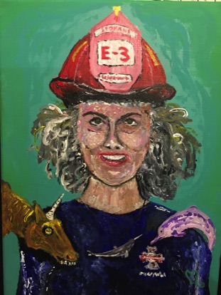 A self-portrait in full-on captain splendor. At my station - these things ruled : dolphins, unicorns and narwhals. Here is a link to a story of the museum we established at Station 3. Later on sasquatch joined the gang. Acrylic.