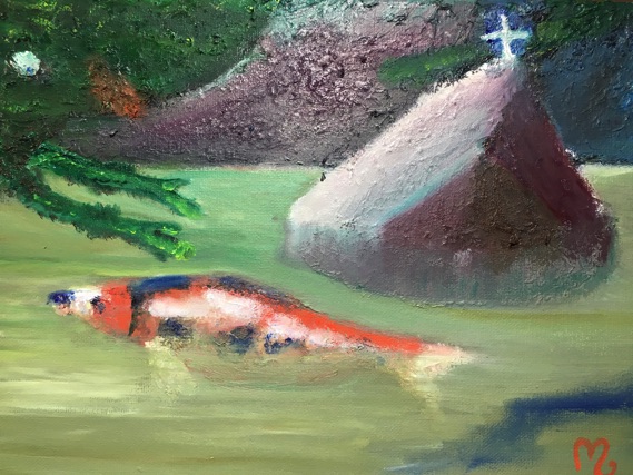 A koi at Nishinomiya Tsutakawa Japanese Garden. A bulbous bush (?) wants to give the fish a hug. Mostly fingerpainted. Oil.