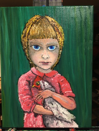 I wanted to do one of those sad-eyed kid paintings. I used a school picture of my wife Sarah to work from. She looked pretty angry, like she had more important things to do than get her picture taken. In these piaintings, a girl is usually holding a cat. Sarah has a chicken. I think chickens are cooler. Oil.